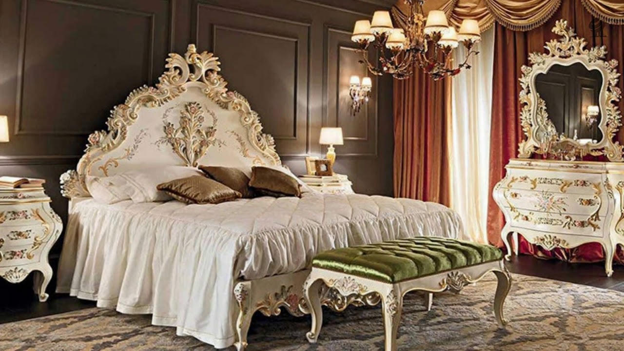 Выбирайте модели с высоким, украшенным резьбой или обтянутым красивой тканью, изголовьем. Не бойтесь дополнить кровать балдахином. Для хранения вещей приобретите массивный, двустворчатый платяной шкаф. Фасады лучше сделать зеркальными или деревянными. Не забудьте о прикроватных тумбочках на высоких ножках и трюмо с зеркалом в красивой раме.