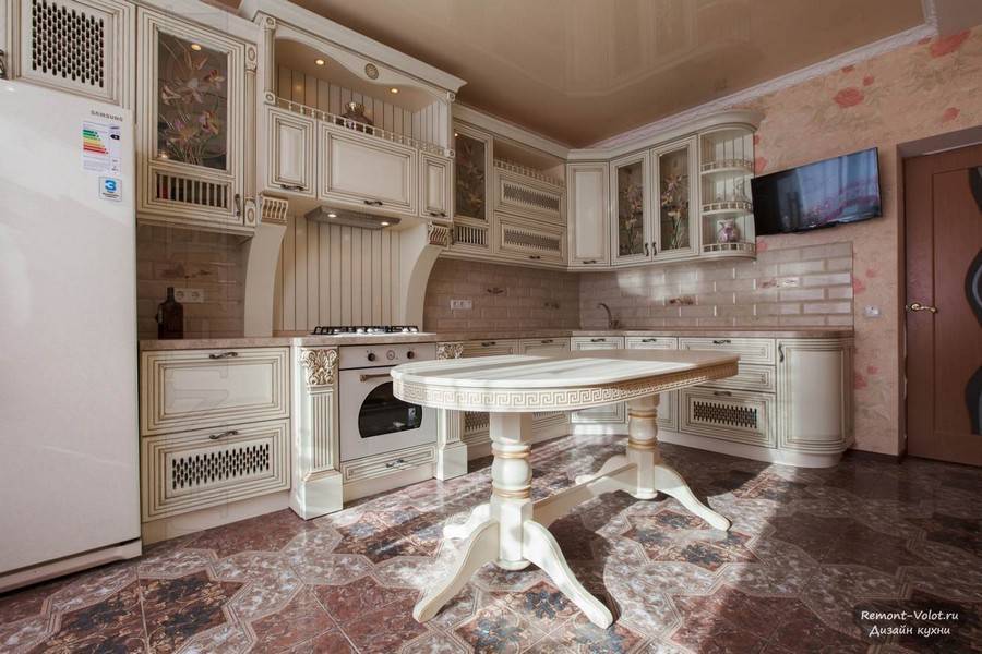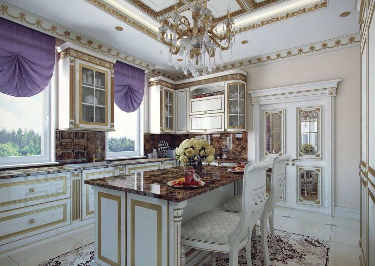 Для кухни стоит выбирать отделку стен краской или штукатуркой, для пола подойдет керамическая плитка под паркет или мрамор. Наиболее привлекательно смотрятся белые кухни с золотой отделкой. Кухонный гарнитур должен быть массивным из дуба, каштана, ясеня, украшенным резьбой и покрытый лаком. Шкафы могут быть со стеклянными вставками.