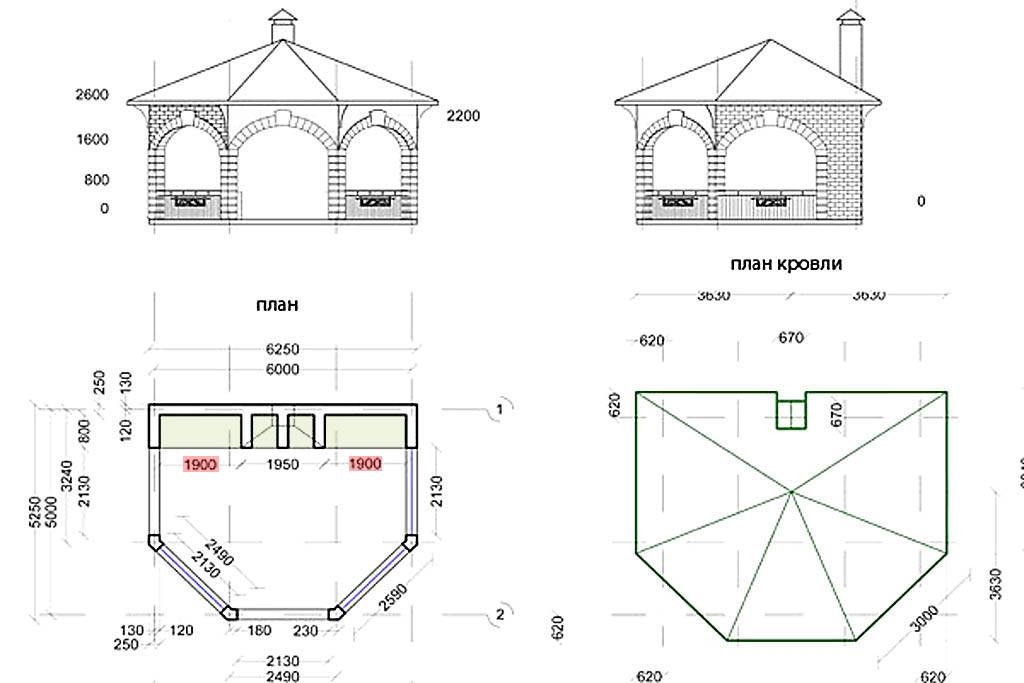 Каким бы важным ни было исполнение стен, кровли и фундамента, стоит думать еще о порядовке (схеме возведения) барбекю. По техническим причинам очень тяжело поставить в беседке высокий дымоход или сделать изощренный комплекс каналов для отвода дыма. От дефлекторов тоже стоит отказаться, потому что это отрицательно сказывается на эстетике сооружения. При выборе среди готовых чертежей имеет смысл отдавать предпочтение тем, где используется меньше всего закладных из стали и мест, обвязываемых проволокой. Чем ниже вероятность воздействия ветра на печь, тем ниже можно делать шатер, зато требуется увеличивать трубу; в более открытых беседках ситуация, конечно, обратная будет.