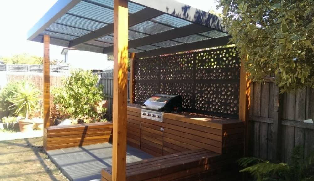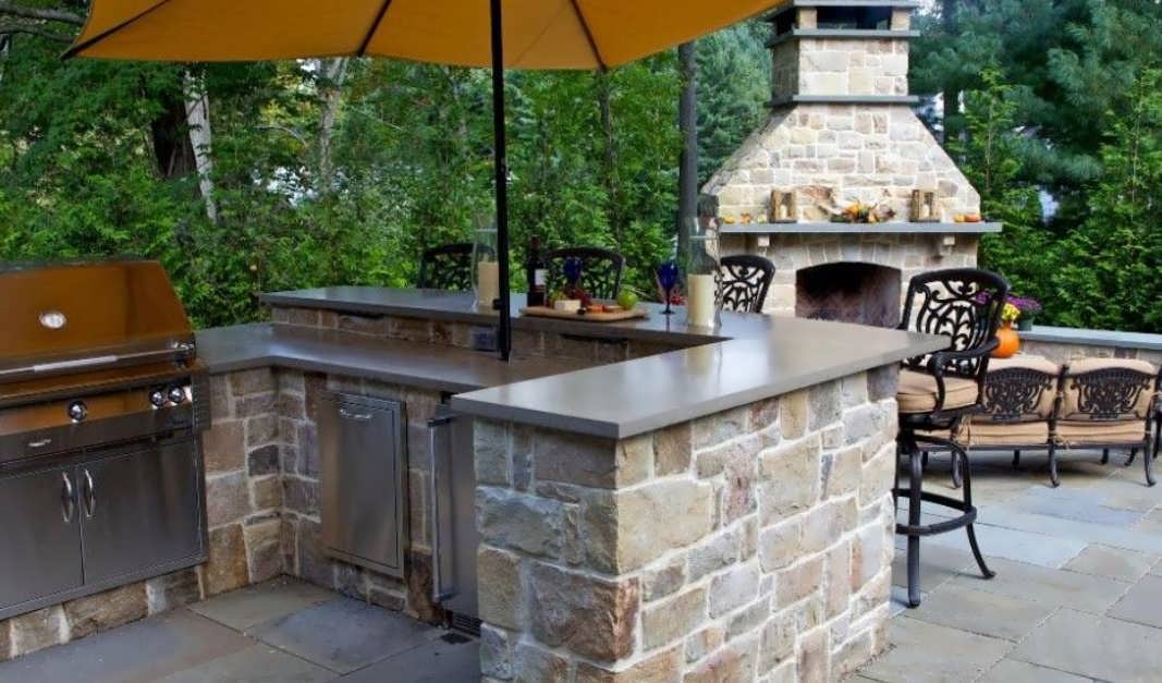 Зону барбекю можно разместить в патио, стены помогут защитить конструкцию от ветра, а близкое расположение к дому позволит использовать все необходимые коммуникации.