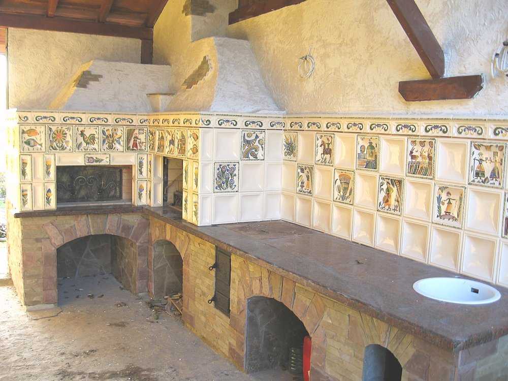 На поз. 2 – самая простая и дешевая, без дымохода. Декоративная облицовка портала под кирпичную арку – из клинкерной плитки на печном клею, см. ниже. Недостаток – сильная зависимость тяги от направления ветра. Достоинство – если дует слабый ровный ветер справа (по рис.), то под навершием (дымовым колпаком) можно повесить продукты для горячего копчения. На поз. 3 и 4 – одно- и двухкамерные печи. Однокамерную можно строить без разделочного стола с мойкой, тогда она будет компактной, шириной всего в 1,1 м с отделкой. В двухкамерную можно ставить сразу мангал и жаровню с рашпером или вертелом.