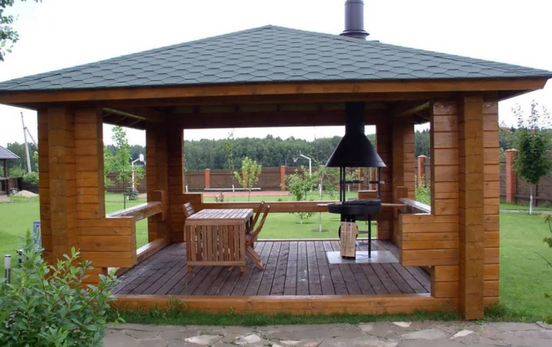 Делают на фундаменте и под навесом. Средние размеры – 6х5 м (на 12 человек). Закрытые в обязательном порядке оборудуются дымоходом, чтобы исключить задымление.