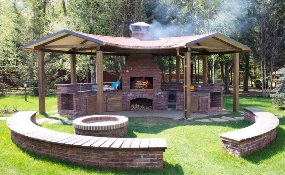 Например, можно остановиться на такой небольшой беседке, в которой приятно проводить время не только в солнечные, но и в ненастные дни. Гости не намокнут под дождем и не запарятся на открытом солнце. В данной печи не предусмотрены все функции, которые могут присутствовать, но мангал, печь и гриль в ней вполне можно разместить. Удобный стол, место для дров и посуды, укрытие от ветра, проведенные вода и электричество — это все что нужно, чтобы накрыть праздничный стол и создать комфортные условия для гостей.