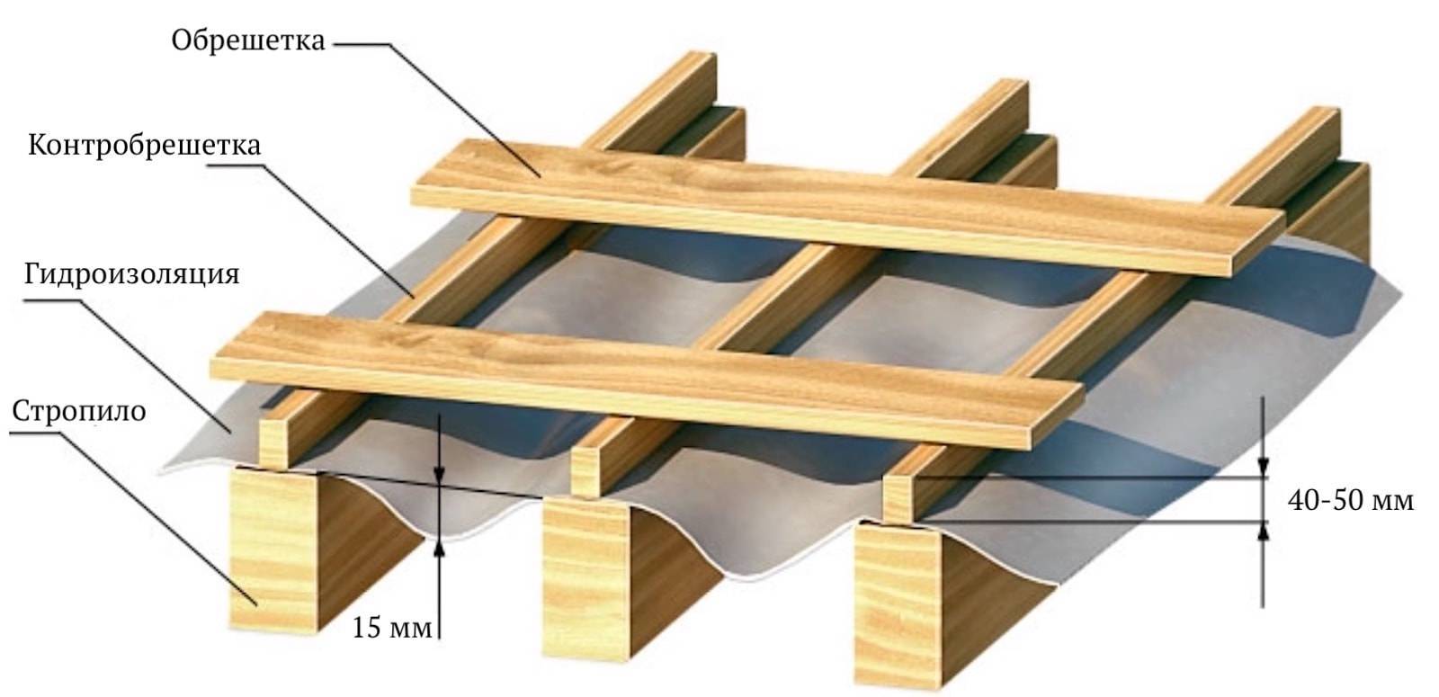 Внутренняя и наружная обрешётка. Набивается перпендикулярно стропилам.