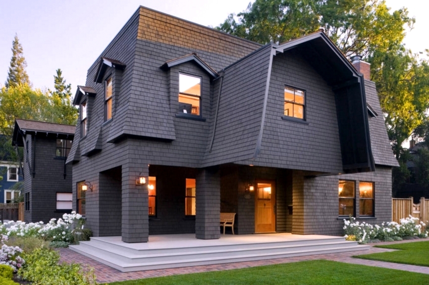 Стандартная конструкция ломаной крыши позволяет опустить свесы карниза намного ниже, не только сделав экстерьер дома весьма оригинальным – такие свесы защищают стены и фундамент дома от ветра и влаги, направляя атмосферные осадки в сторону от жилья.