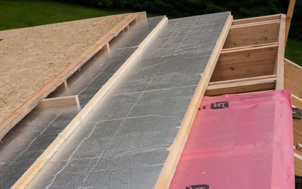 Назначение пароизоляции – не дать возможность испарениям изнутри мансарды проникнуть внутрь «кровельного пирога». На сегодня, самый популярный материал представляет собой многослойную фольгированную пленку. Пароизоляция укладывается фольгой внутрь помещения, что позволяет отражать внутреннее тепло и сохранять его.
