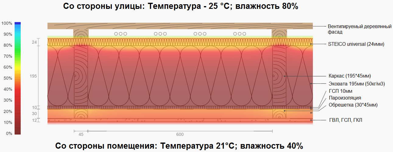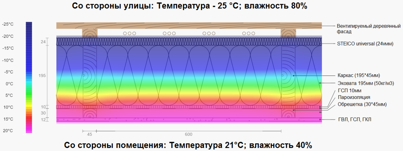 Как можно убедиться, отсутствие перекрестного утепления имеет минимальное значение (перепад около 1°С по оси стойки) и этим можно пренебречь для расчета общих теплопотерь дома, т.к. на общий показатель теплопотерь стены это не оказывает практически никакого влияния.