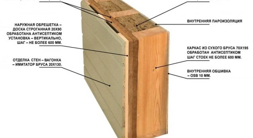 Для его установки набивают обрешетку из брусков 50 мм так, чтобы создать свободный проход для выхода влажного воздуха. Обрешетка для вентканала будет основанием для фасадной отделки.