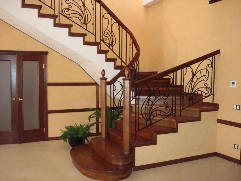 Лестница с перилами с элементами художественной ковки Источник olestnicah.ru Перила должны подчёркивать, улучшать или просто соответствовать стилю оформления как самой лестницы, так и всего помещения. Поэтому при неправильном подходе, не умении или отсутствии видения художественного оформления данные элементы конструкции лучше заказать или купить в готовом виде в специализированных компаниях.