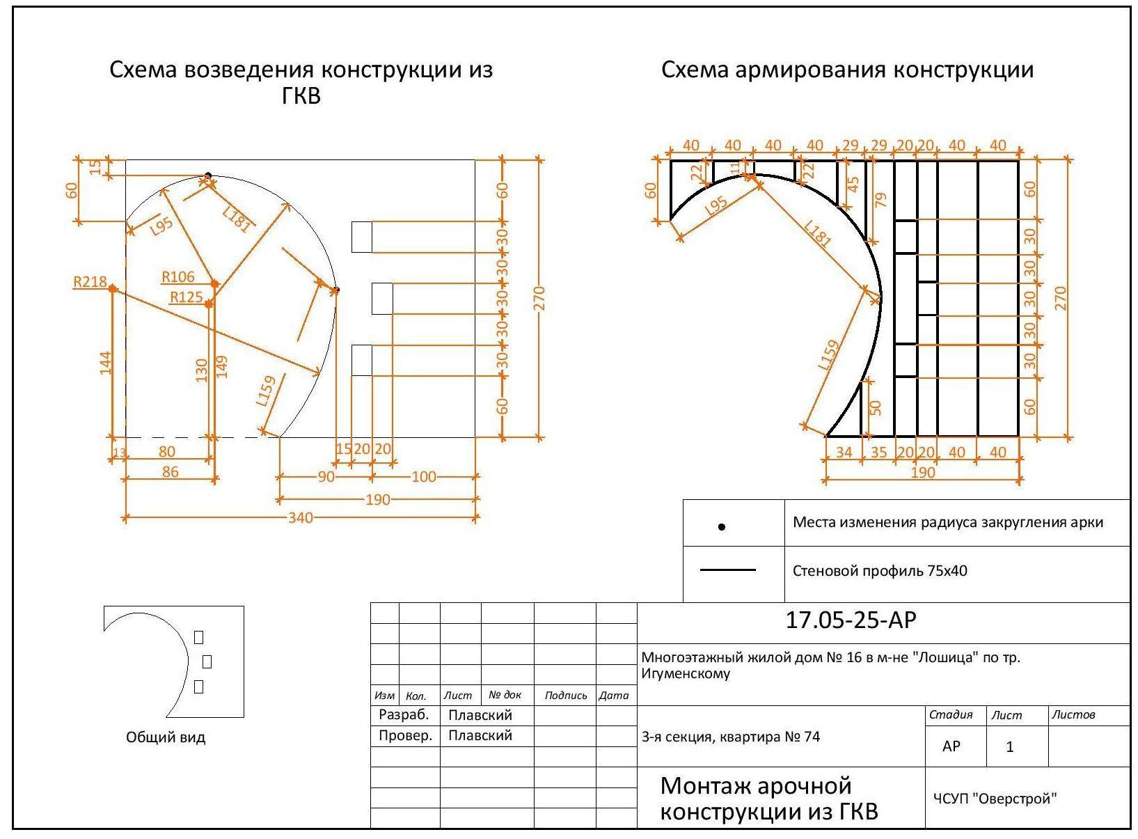 Как видно из чертежа, кривая арочного проема достаточно сложна, имеет несколько сопряженных радиусных дуг, дополнительно конструкция имеет три прямоугольных небольших проема. Схема армирования перегородки основана на использовании нескольких вертикальных стоек полной длины и большого количества скрепляющих перемычек, а также арочного профиля. Общее количество необходимых материалов здесь посчитать сложнее, причем необходимо учитывать запас не менее 10…15% на случай непредвиденных сложностей при раскрое профиля и ГКЛ. Укрупненно расчет делается на основании данных чертежа: