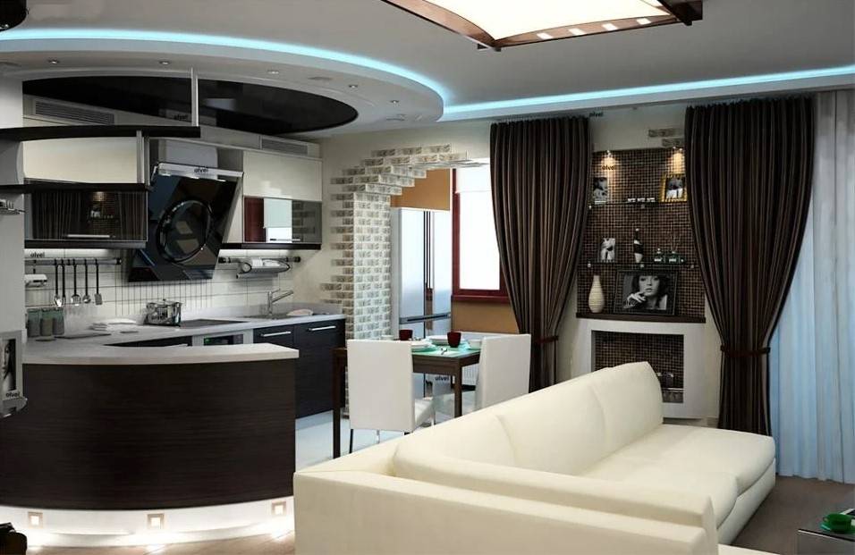 С помощью двухъярусного натяжного потолка можно разделить на соответствующие зоны малогабаритную квартиру, где чаще всего кухня совмещена с гостиной. В таких ситуациях потолочная конструкция дополняется установкой различных геометрических деталей или разграничивает пространство посредством прямых линий.