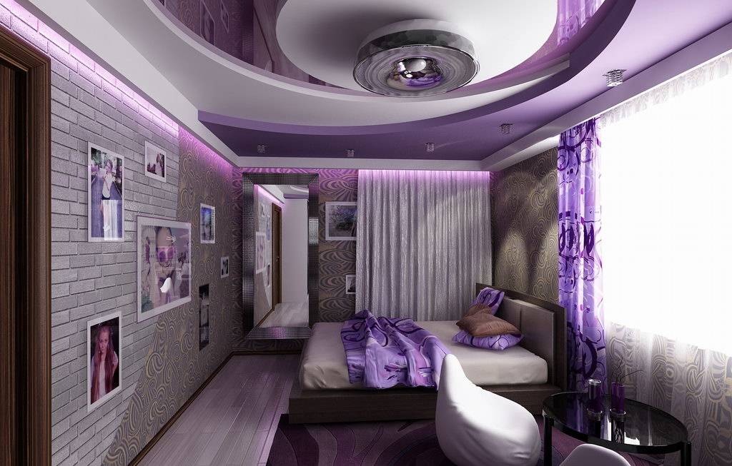 Для создания романтической атмосферы в спальне следует подбирать светлые оттенки, а непосредственно многоярусную конструкцию на потолке дополнить скрытой подсветкой.