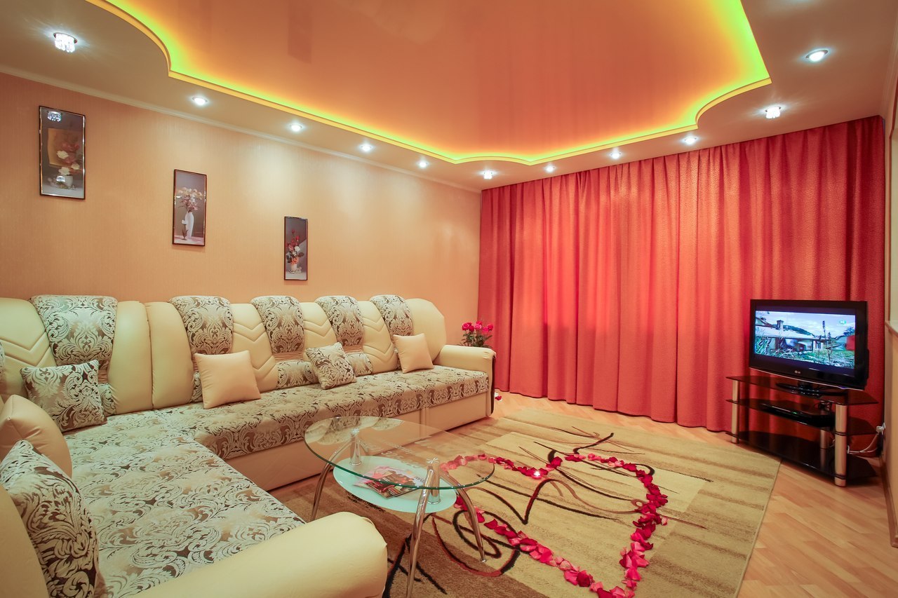 Уже редко где можно встретить традиционные люстры, висящие в центре комнаты. С помощью двухуровневых натяжных потолков с подсветкой в зал можно получить уютное и неповторимое помещение. Грамотные сценарии освещения позволяют творить настоящие чудеса. Одна из схем – подсветка точечными светильниками, расположенная по периметру полотна. Небольшие осветительные приборы будут формировать мягкий и рассеянный свет.