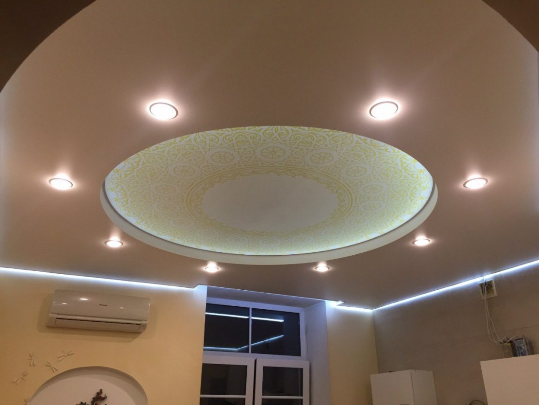 - Оперативность монтажа и сокрытие недостатков базовой поверхности. Двух уровненные натяжные потолки скрывают даже значительные выступы, массивные трубопроводы, чем выгодно отличаются от одноярусных.