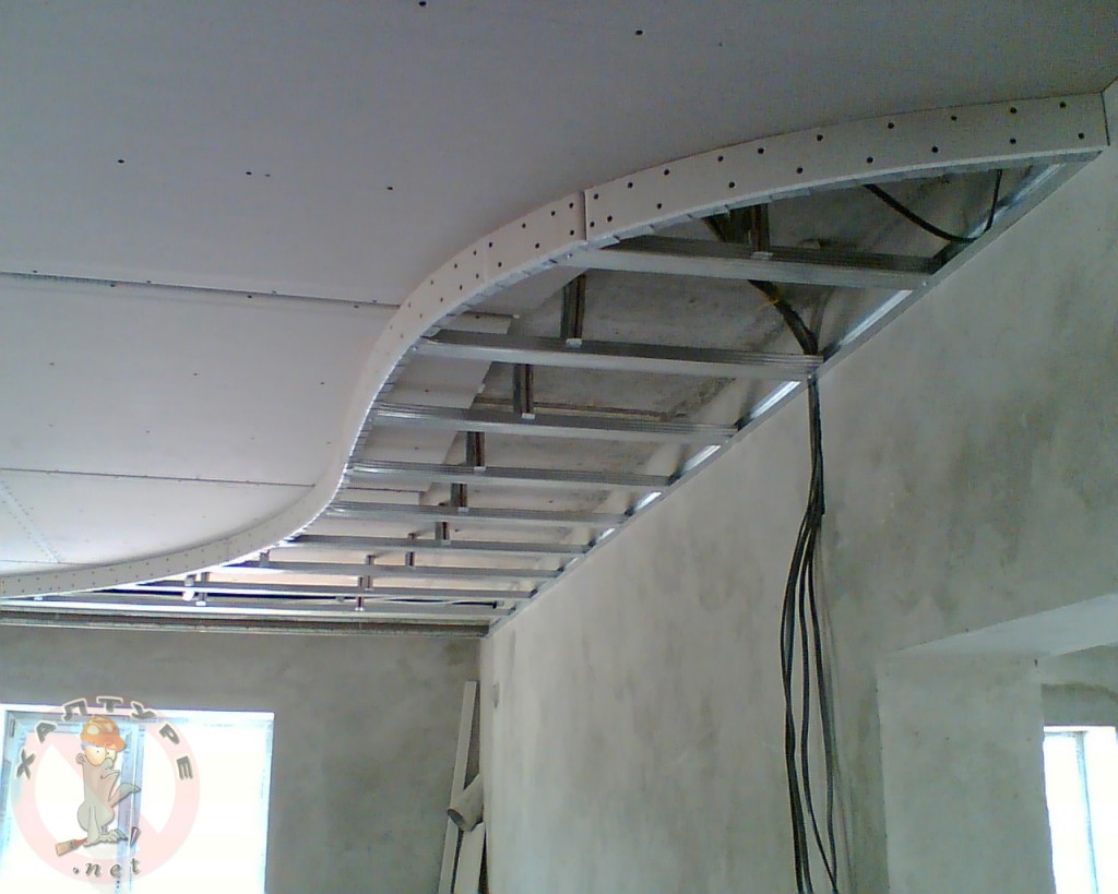 - К стенке прикручиваем тот же профиль UD, имеющий 25 мм в ширину и между стенкой и изгибом вставляем профили CD, прикручивая их саморезами к держащим их профилям. Если Профиль CD окажется длиннее 50 см, то его следует дополнительно укрепить подвесом, прикрученным сквозь ГКЛ к верхнему каркасу.