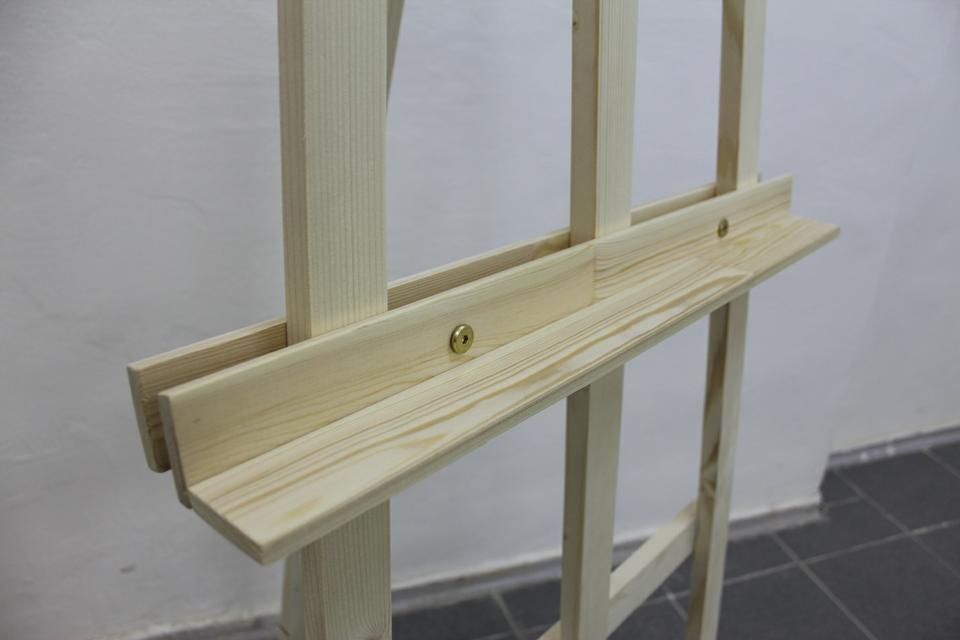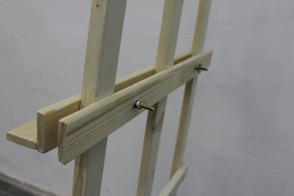 Конструкция состоит из центральной деревянной планки, к которой крепятся фиксатор, стрела, полочка для холста. Фиксатор регулирует высоту и угол наклона. Стрела и полочка – единое целое. Крепится к центральной стойке. Определяет высоту с помощью прорезей и стержня с рукояткой. Соединяются элементы на крепком основании, которое может выдержать несколько холстов.