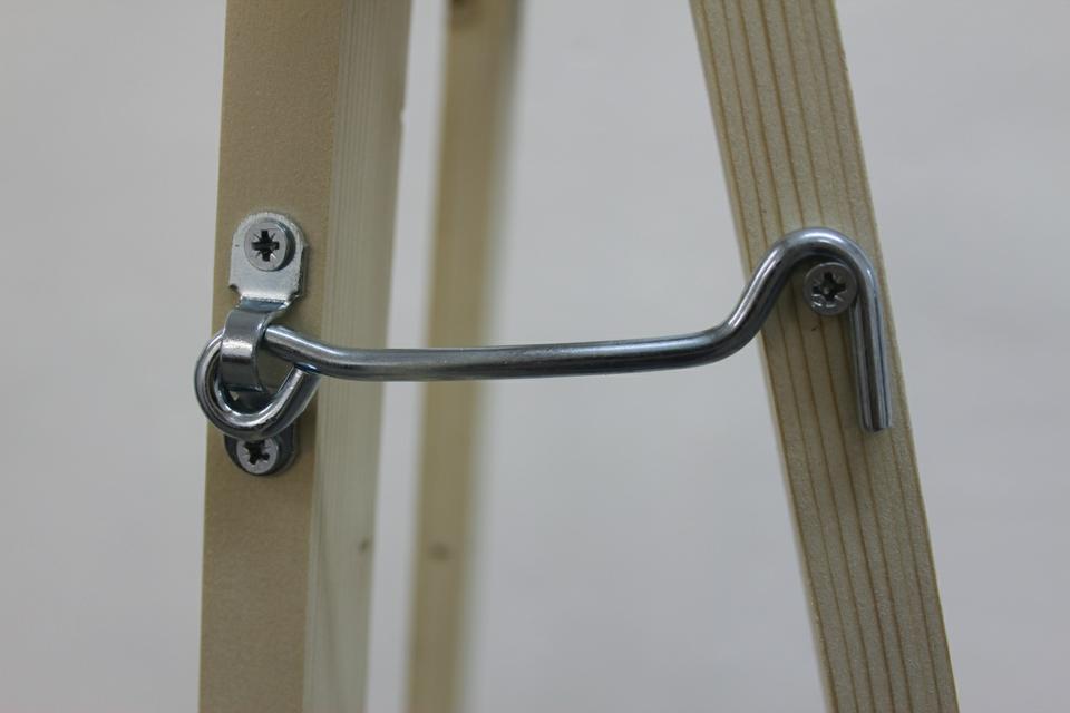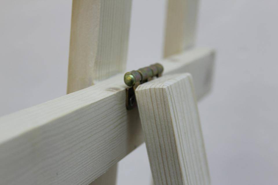 Даём клею просохнуть и на следующий день заканчиваем сборку мольберта: ставим его в горизонтальное положение, устанавливаем полочку для подрамника. Регулируем её по высоте. Закрепляем навесной крючок, фиксирующий заднюю опору. На свой вкус Вы можете подобрать бесцветный лак, морилку или краску. Вот теперь Ваш мольберт полностью готов!
