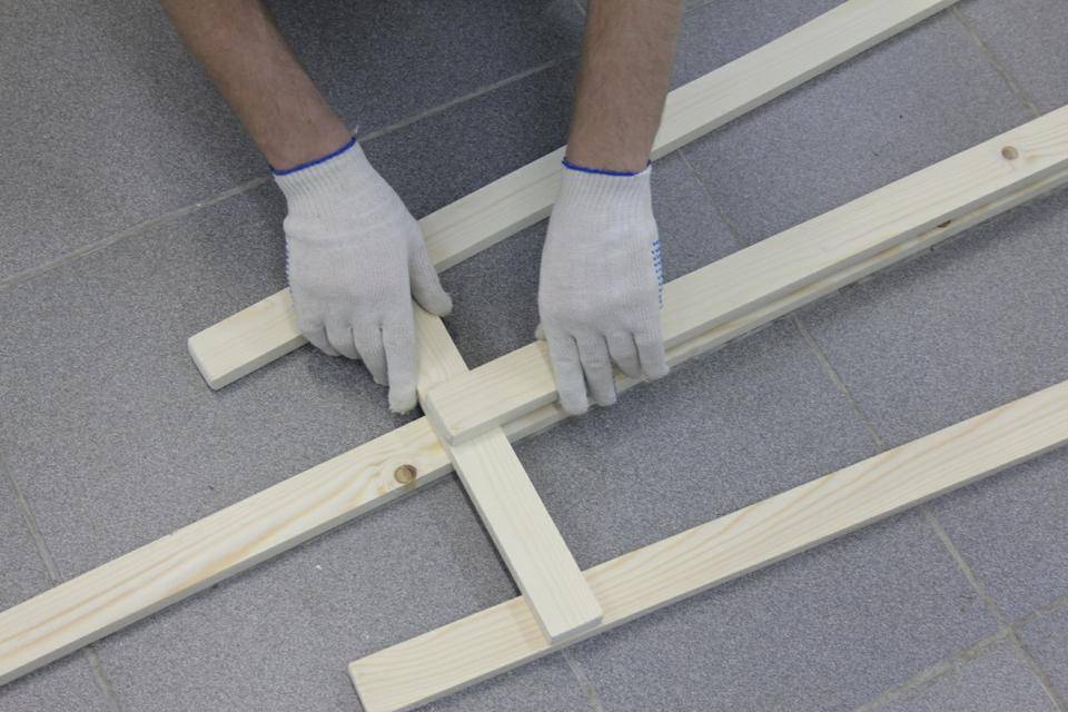- Найти центр у длинных опор, саморезами к ним прикрепить поперечины длиной в 50 см.