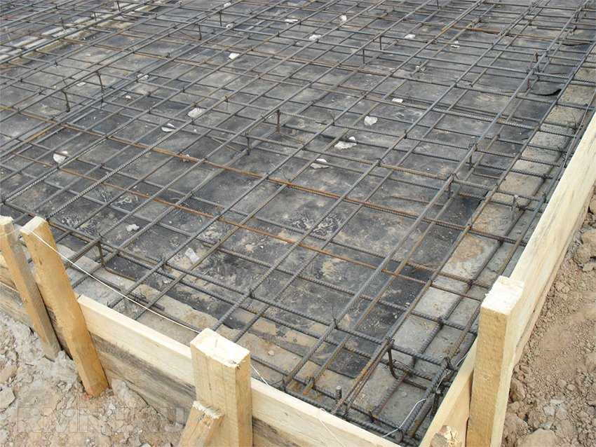 - На дне подготовки формируется арматурный каркас, состоящих из двух сеток из арматуры диаметром 12-16 мм (размер ячеек — 25*25 см). Верхний и нижний пояс каркаса соединяются вертикальными перемычками. Каркас должен быть утоплен в толщу плиты на 5 см с каждой стороны.