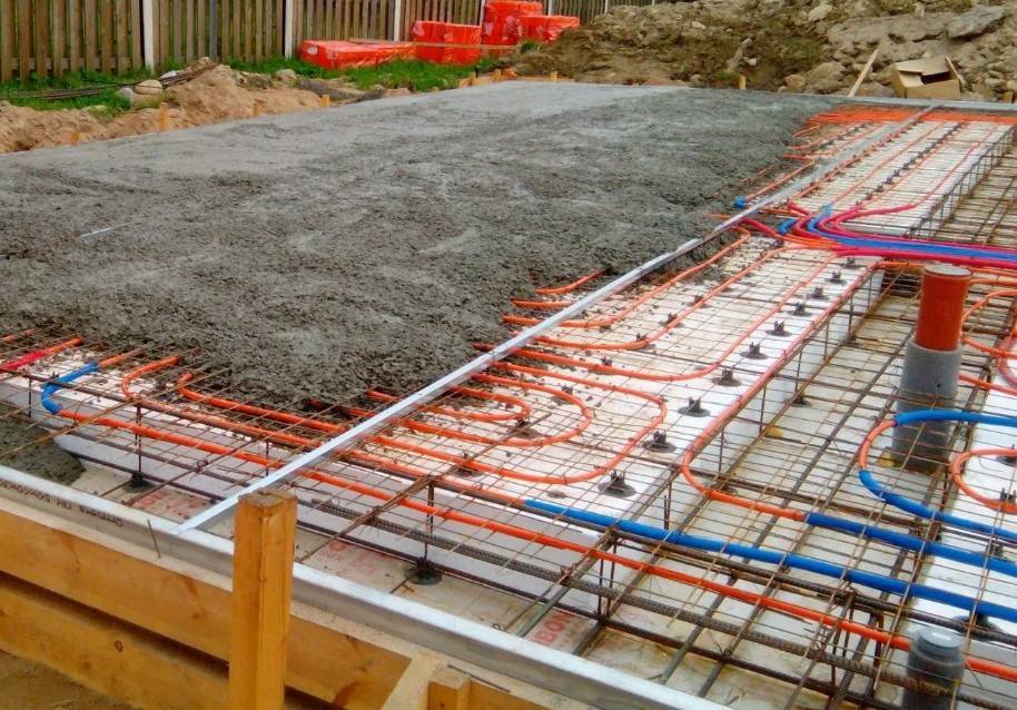 Арматурный каркас. Обычно он представляет металлическую сетку, уложенную в два ряда параллельно. Не забывайте, что на также данном этапе монтируются отводы коммуникации.