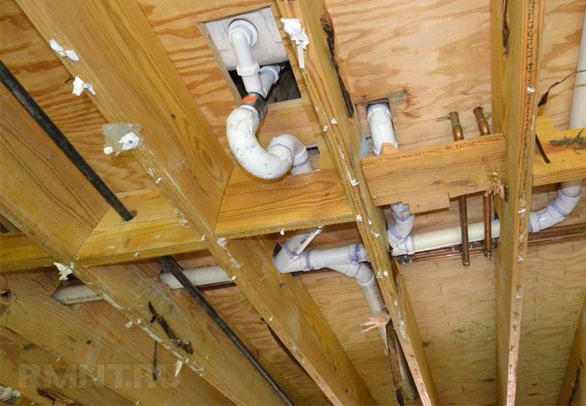 Перекрытие на балках допускает прокладку таких коммуникаций, как электросеть и система трубопроводов водоснабжения и отопления. Для прохода через балки перекрытия их можно сверлить, но диаметр отверстия не должен превышать 1/4 от сечения балки по высоте.