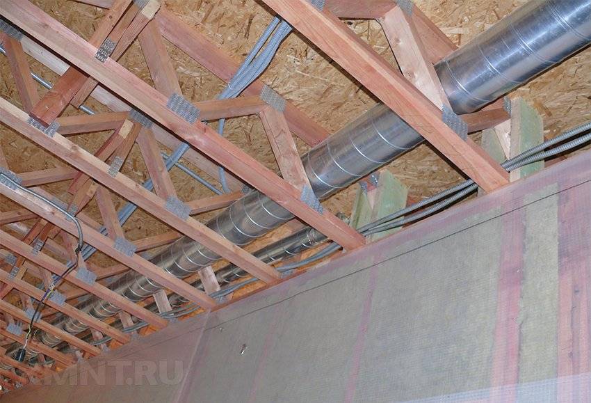 В таких случаях вместо балок используют деревянные фермы. Их главные составляющие — несущие пояса и система связей, прямых или наклонных. В полостях между элементами фермы достаточно места для прокладки коммуникаций любого рода, к тому же они легковесны: около 90% объёма перекрытия занимает воздух или утеплитель, что способствует хорошей тепловой и звуковой изоляции между этажами.