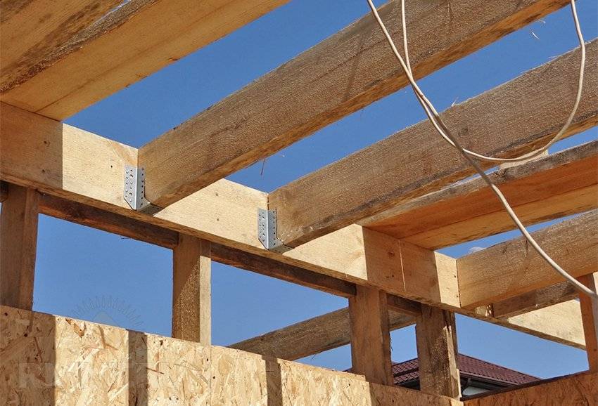 В домах со стенами из кирпича или блоков балки обычно заделываются в «гнезда» на глубину не менее 100 мм (доска) или 150 мм (брус). В деревянных домах их, как правило, укладываютс в специальные зарубки на глубину не меньше чем 70 мм. При использовании специального металлического крепления (хомутов, уголков, кронштейнов) длина балок будет равна пролету — расстоянию между противоположными стенами, на которых они крепятся. Иногда, при монтаже стропильных ног крыши непосредственно на деревянные балки, их выпускают наружу, за пределы стен на 30-50 см, формируя, таким образом, свес крыши.