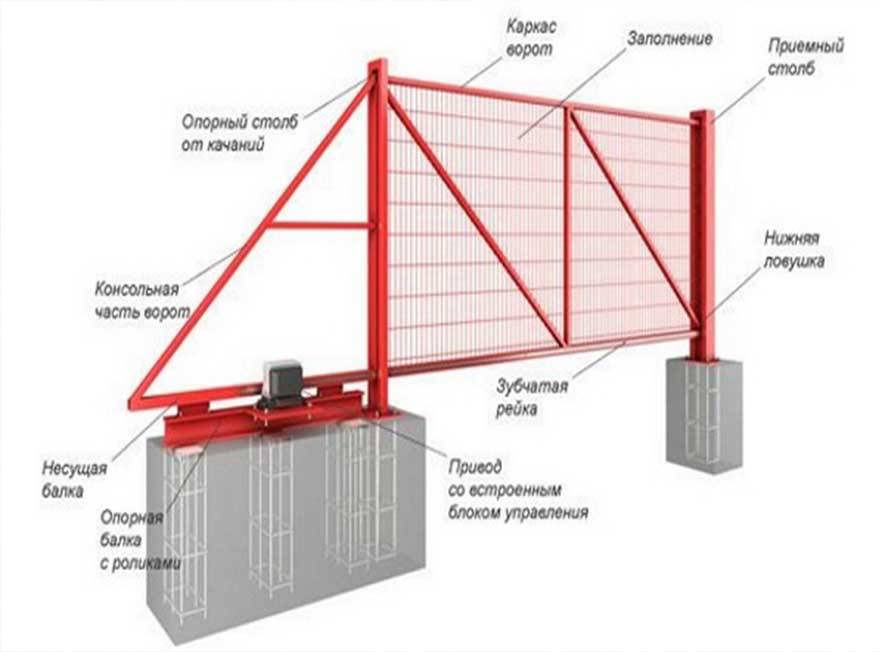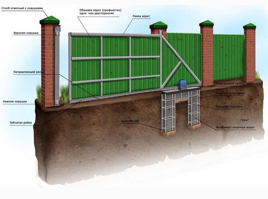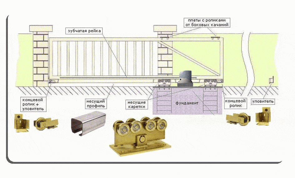 В общем, главными элементами откатных ворот, отвечающими за изменение положения дверного полотна, считаются:
