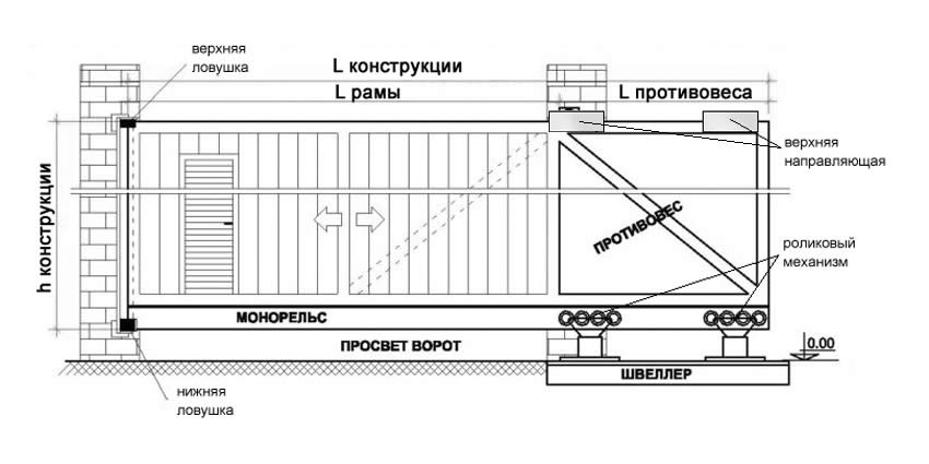 Для создания корректного чертежа ворот с откатным механизмом необходимо точно рассчитать размеры двух основных частей — проемной и противовесной.