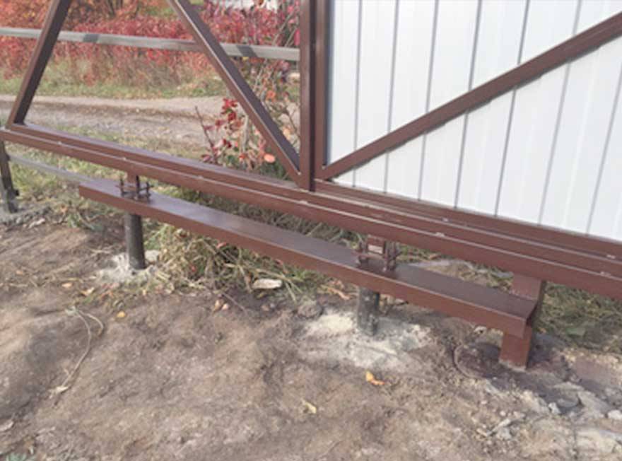 Тележки монтируют на бетонное основание, создаваемое в начале работ по сооружению механизма дверной конструкции, монтируемого в стороне от проездной площадки. Полотно откатных ворот движется по рельсу, то есть стальной узкой балке, прикреплённой сварочным аппаратом под рамой. Рельс выполняет функцию направляющей и выдерживает вес всей конструкции.