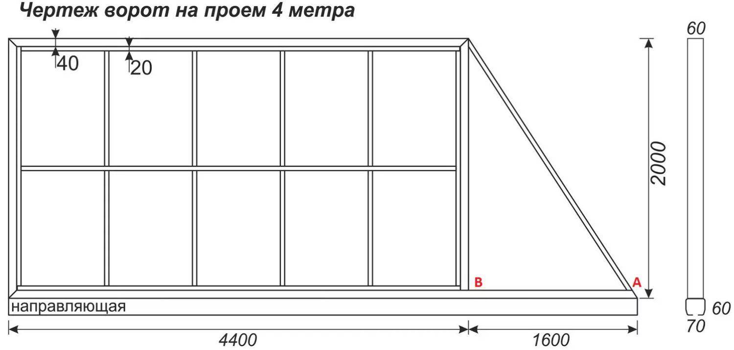 Классический чертеж откатных ворот с четырехметровым проемом.