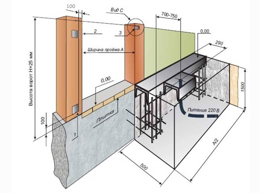 - наличие металлической закладной детали, она должна иметь соответствующие размеры – до 20 см с боковым выступом (общая ширина увеличивается до 50 см), чтобы можно было предусмотреть возможность установки электропривода, а не только роликового механизма, если планируется монтаж автоматических ворот;
