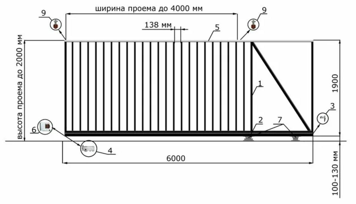 Классический чертеж откатных ворот с четырехметровым проемом.