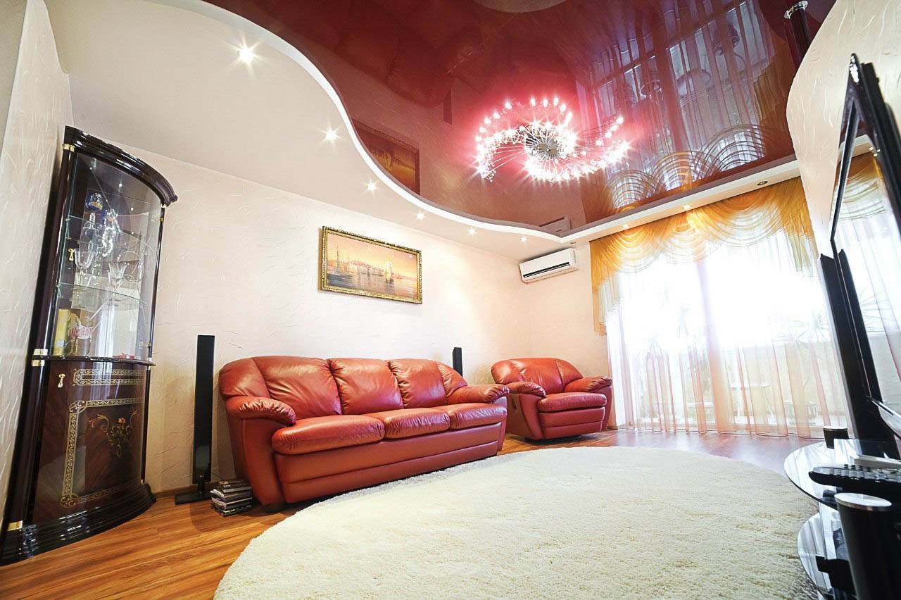 Полотно можно монтировать в разных уровнях. Это придает гостиной определенное своеобразие, а также позволяет скрыть под натяжным потолком различные системы жизнеобеспечения.