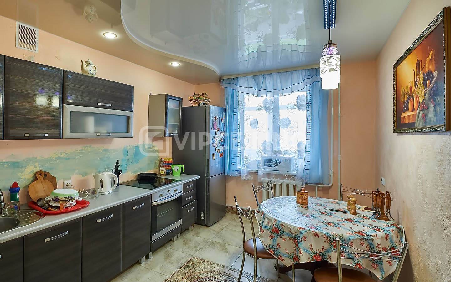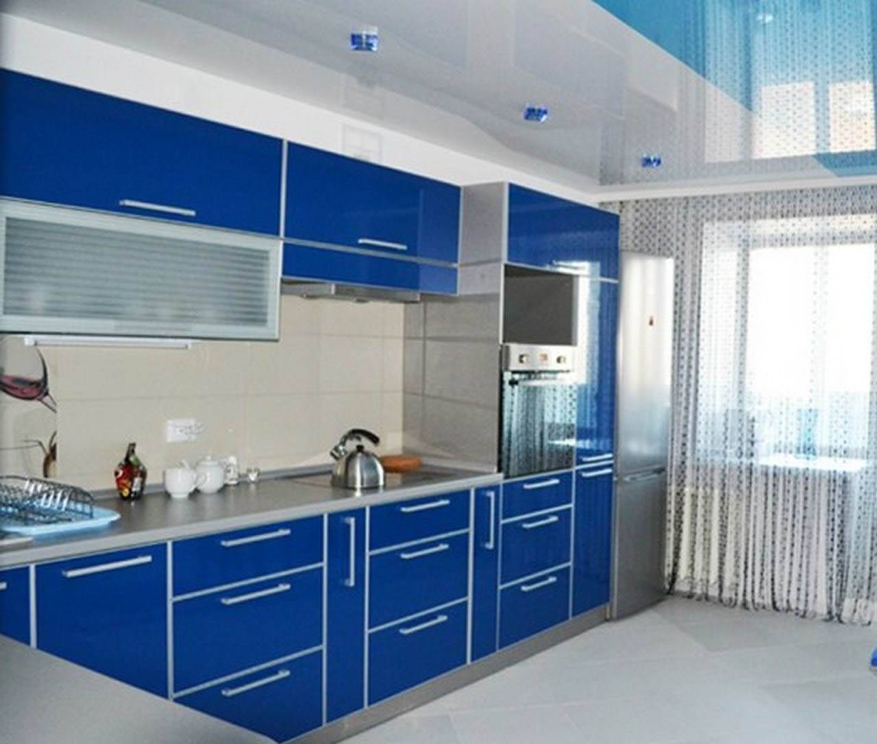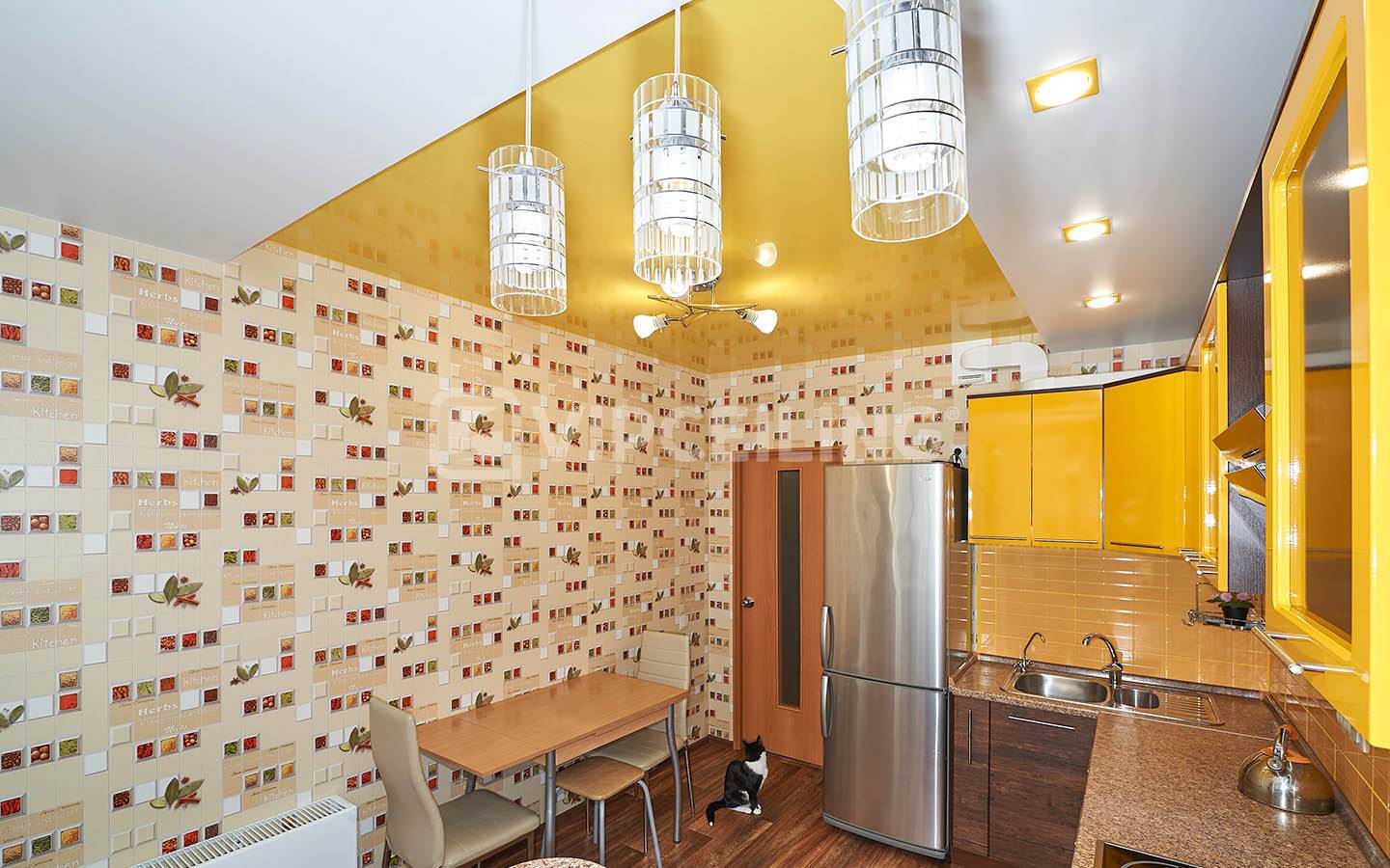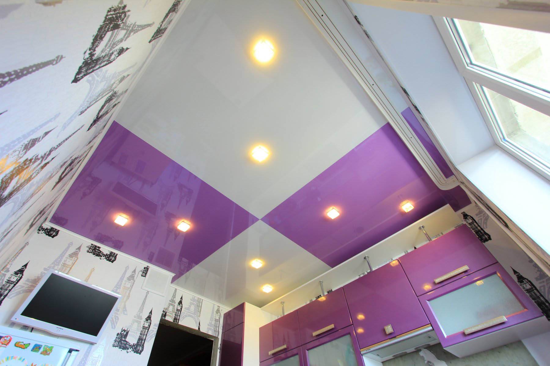 На кухне и вовсе двухцветные натяжные потолки могут выполнять не только декоративную, но и разделительную функцию, выгодно делая акцент на обеденной или рабочей зоне.