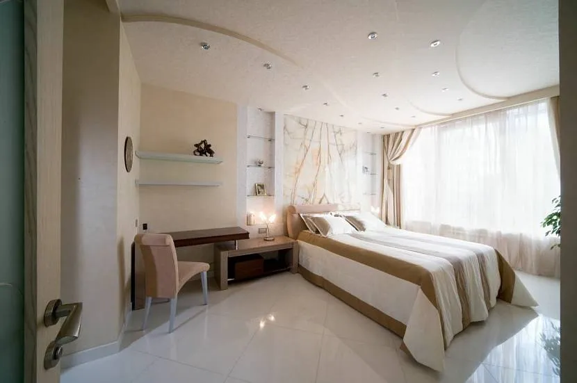 Натяжной потолок в спальне, обустроенный точечными светильниками (спотами) – один из наиболее популярных вариантов. Они могут использоваться не только в качестве основных источников света, но и в декоративных целях. Другой вариант их применения подразумевает зонирование пространства помещения. Например, отделение рабочего пространства, гардеробной или будуара. Классифицируется это на заполняющий и подчёркивающий свет.