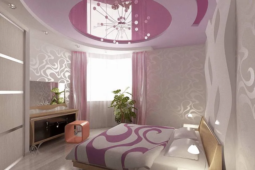Дизайн натяжного потолка во многом зависит от назначения комнаты. Для одноуровневой конструкции в спальне предпочтительны: