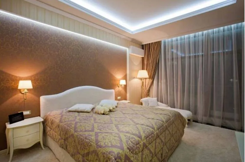 Диодная лента с натяжными потолками спальнойИсточник potolok-nedorogo.ru