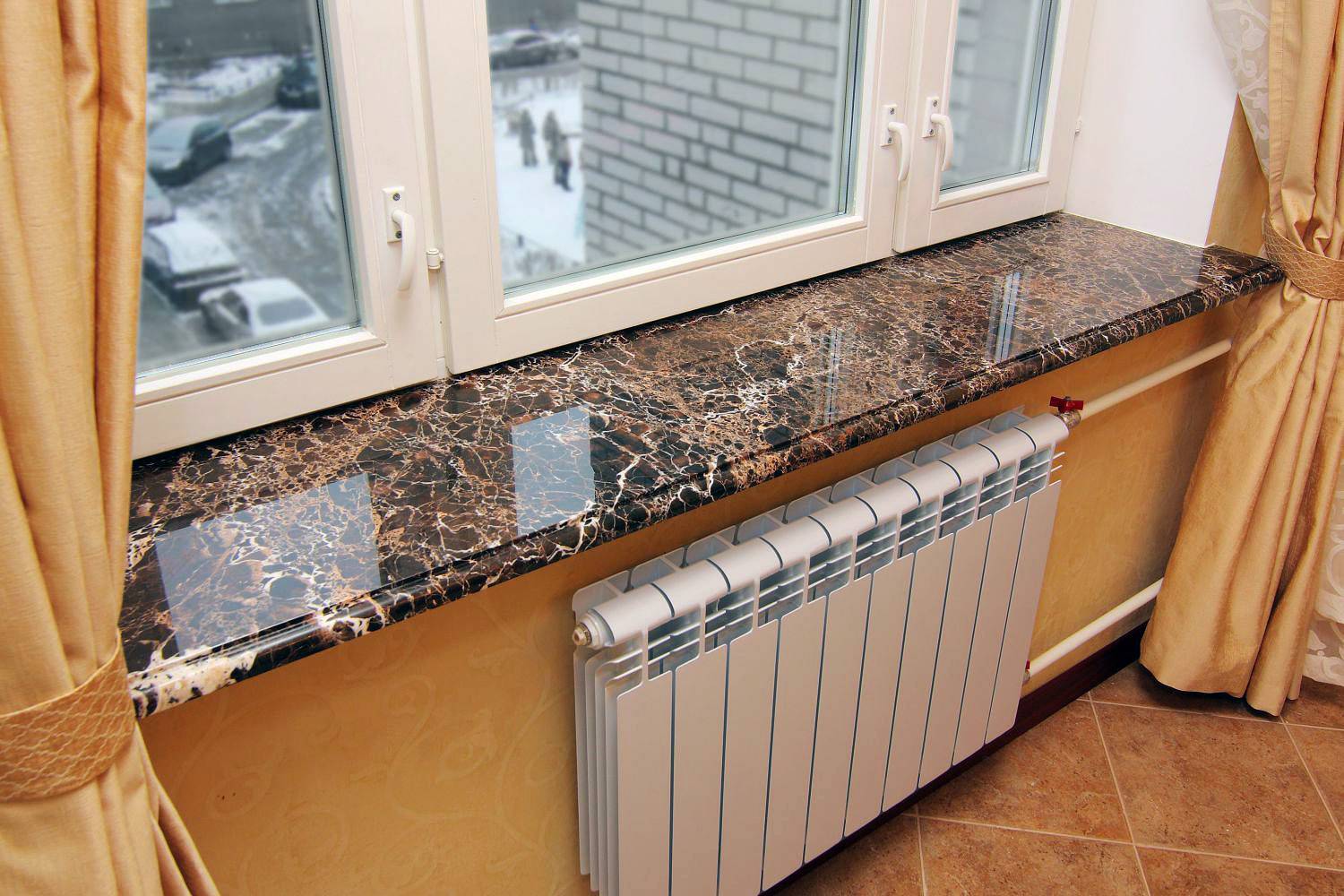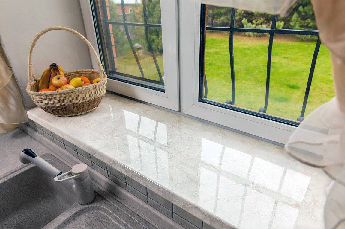 Производители выпускают различные модели с богатой палитрой оттенков, со всевозможными вкраплениями и узорами. Для классического интерьера подходит каменная оконная панель белого цвета. Такой подоконник делает свой вклад в респектабельность и эстетичность помещения. К достоинствам материала относится высокая прочность, устойчивость к негативным факторам и длительный срок эксплуатации. При появлении дефектов изделие легко реставрируется. Современное оборудование позволяет изготавливать подоконники любой формы.