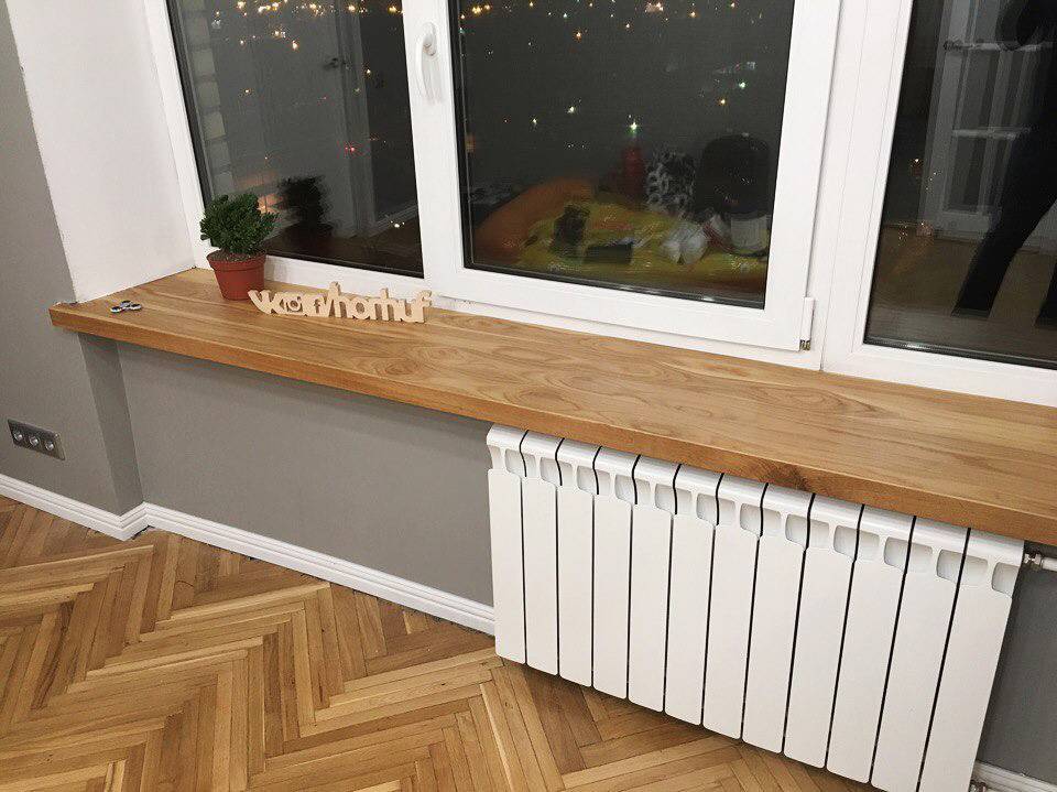 Изделия из натурального дерева изготавливаются из различных пород, включая дуб, каштан, сосну, бук, ясень. Правильная обработка материала делает подоконник защищенным от влаги и устойчивым перед другими негативными факторами. Отсутствие вредных компонентов в составе и благородный внешний вид – это основные преимущества таких моделей. По стоимости самым дешевым вариантом будет сосна, к премиальному ценовому сегменту относится вишня, дуб, ясень. Дополнительно поверхность покрывается защитным лаком.