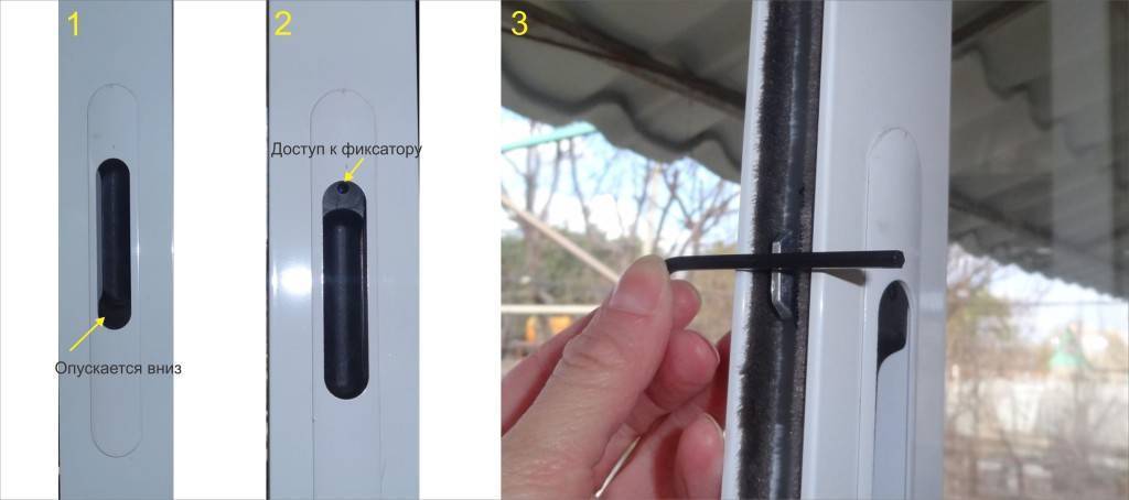Во втором случае, когда не защелкивается язычок, нужно его вытащить. Берем ключ № 3. Язычок удерживает фиксирующий винт. Чтобы до него добраться, нужно потянуть ручку открывания вниз (шаг 1 на картинке). Вверху появится отверстие, в которое вставляется 3 мм шестигранник и вращается в направлении противоположном относительно расположения фурнитуры (шаг 2 на картинке). Например, если защелка расположена на левой торцевой части створки, то ключ вращается вправо и наоборот. Ослабив фиксирующий винт, можно спокойно вытянуть, ставший подвижным, язычок наружу до уровня “заподлицо” с краем рамы (шаг 3 на картинке).