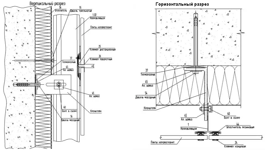 Облицовка стен плитами (вентилируемая фасадная система) состоит из нескольких конструктивных элементов: