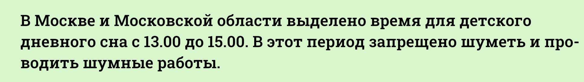 Обязательный режим тишины по будним дням и выходным определён в Подмосковье, Тюмени и Тюменской области, во Владивостоке, в Приморском и Хабаровском краях Оно длится в будние дни и в выходные с 13-00 до 15-00.