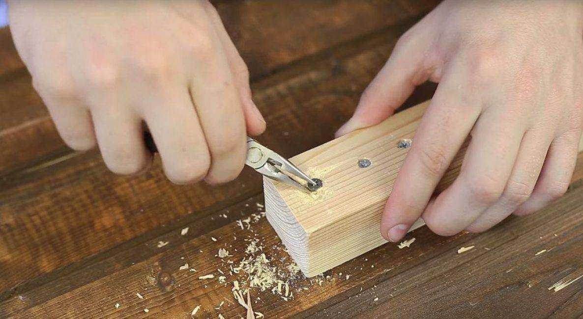 Данный способ применяется в том случае, если не жалко испортить внешний вид доски, в которую был вкручен шуруп. Это самый надёжный способ, суть которого сводится к очистке от древесных волокон места расположения шляпки шурупа с последующей его экстракцией любым удобным способом.