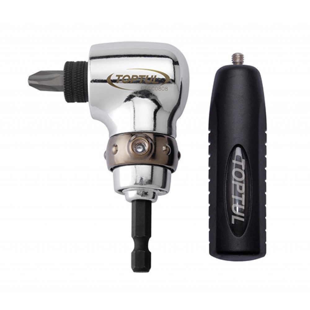 Угловая насадка на шуруповёрт может работать по двум схемам: гибким изменением оси вала инструментальной головки шуруповёрта, либо механическим переносом оси влево/вправо от предполагаемой оси ввинчивания.