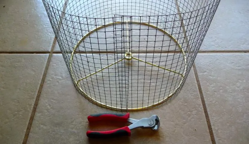 Основа из сетки. Для формирования основы под абажур подойдет стальная сетка из ближайшего строительного магазина (с ячейкой 15×15 или 20×20 мм). Кусок сетки сворачивают в виде цилиндра или усеченного конуса, край скручивают проволокой. Минус сетки: другую форму из нее свернуть вряд ли получится.