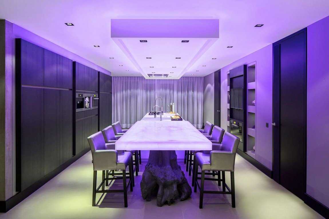Деление этого помещения на зоны обуславливает использование общего света и акцентирование отдельных участков. Кухонные гарнитуры часто комплектуют встроенными приборами, в противном случае можно закрепить под верхними ящиками несколько энергосберегающих устройств. Над обеденным столом размещают длинные подвесные плафоны или трековые конструкции. Главное, не использовать лампы с голубоватым свечением – оно делает блюда неаппетитными.