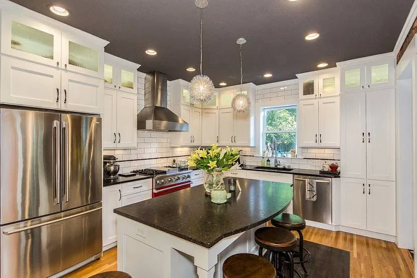 Использование серого цвета для отделки потолков пространства кухонь и столовых получило широкую популярность благодаря практичности, которая выражается в меньшей заметности загрязнений на поверхности таких покрытий. По цветовой гамме дизайнеры рекомендуют стальной оттенок, обеспечивающий гармоничное сочетание с металлическими хромированными поверхностями бытовой техники.
