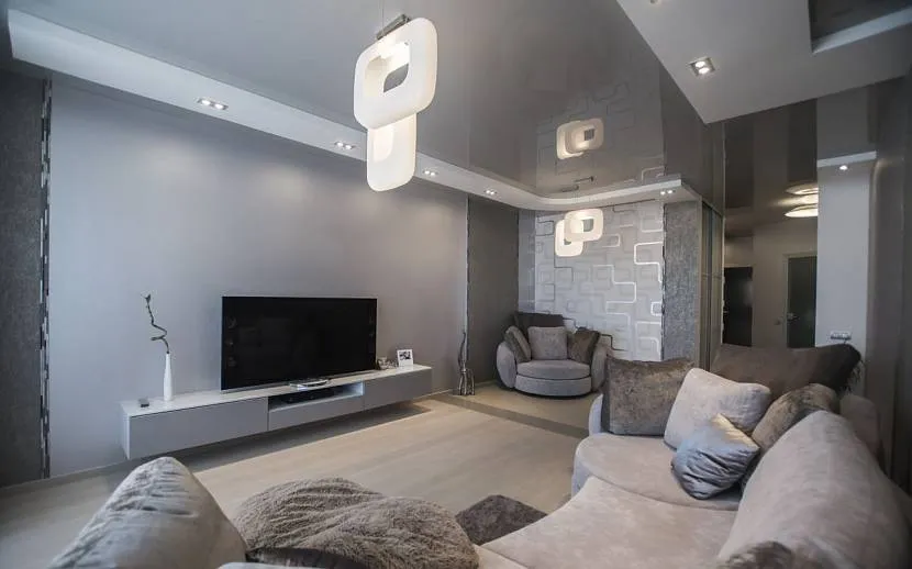 Серый натяжной потолок будет всегда идеально ровным. Классификация в зависимости от вида поверхности: глянец, матовый, сатин (полуматовая поверхность). Несколько главных плюсов: