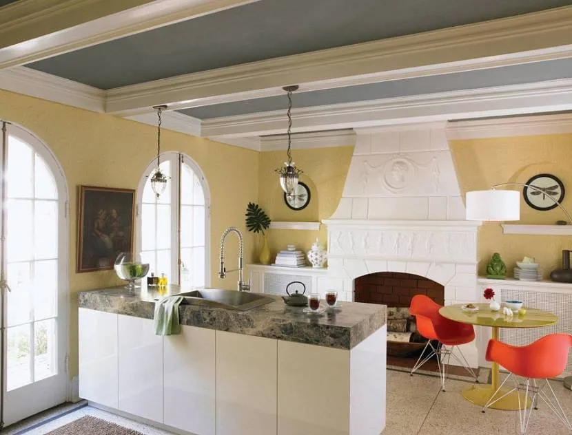 Желтый потолок придаст яркости даже самой мрачной кухне. Эмоциональный, позитивный цвет будет поднимать настроение за завтраком, и возвращать заряд бодрости за ужином.